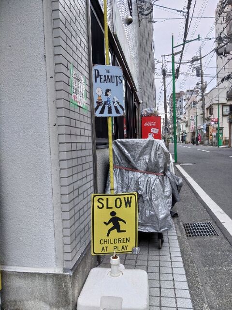 黄色の看板(SLOW)の上に水色(PEANUTS)看板もつけました。
